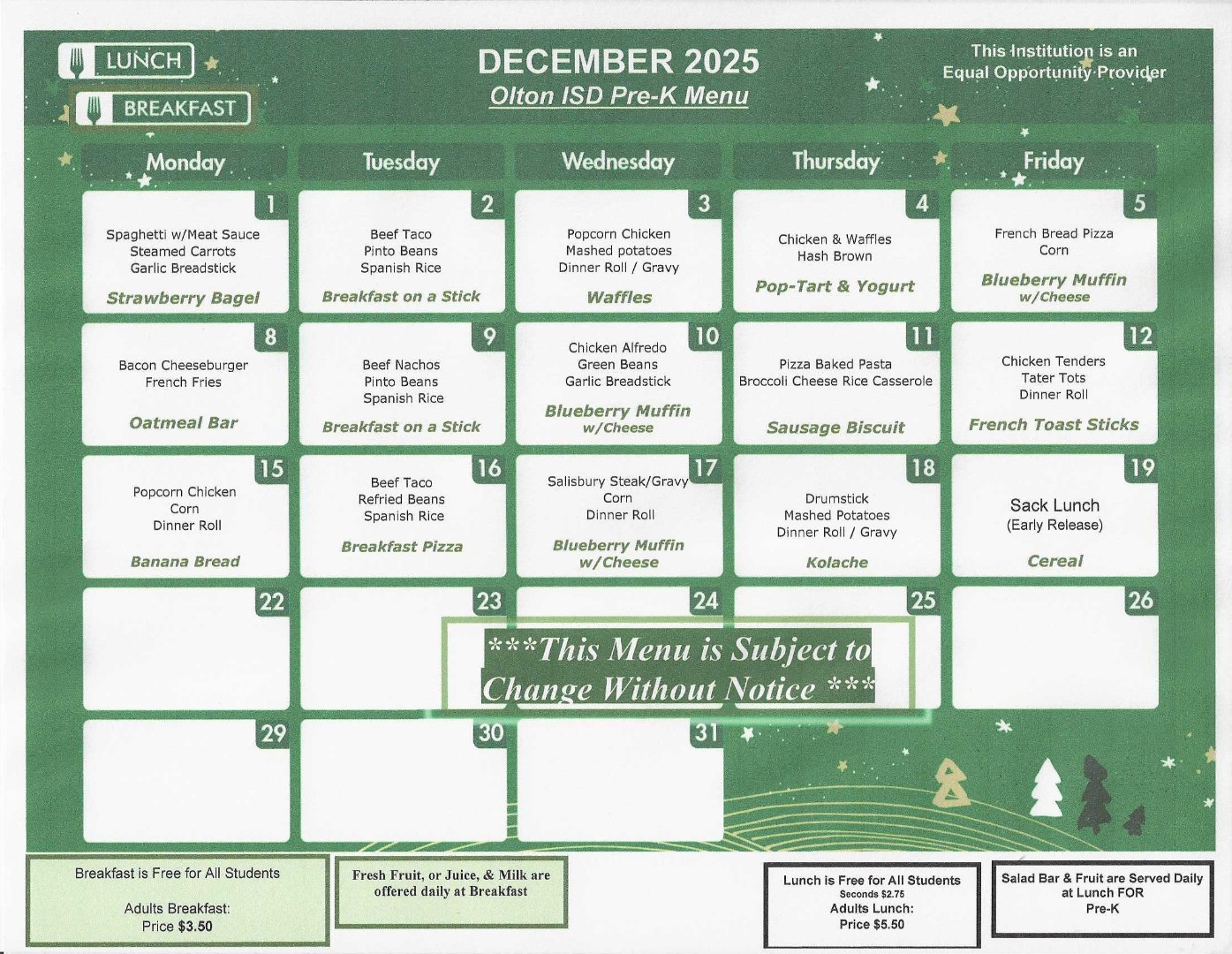 The Olton ISD announced it will operate the Community Eligibility Program (CEP) under the National School Lunch Program and School Breakfast Program for the 2024-2025 school year. Schools qualifying to operate CEP serve breakfast and lunch to all children at no charge and eliminate the collection of meal applications for free, reduced-price, and paid student meals. This approach reduces burdens for both families and school administrators and helps ensure that students receive nutritious meals.